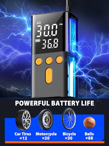 Durable and Long:Once fully charged, this portable air pump for inflatable has an impressive capacity. It can inflate 12 car tires, 20 motorcycle tires, 30 bicycle tires, or 88 balls. Ideal for long trips or frequent use, you won’t fret over battery power.
