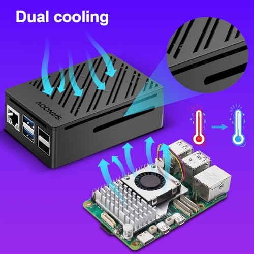 ❄️ Active Cooler & Actively Adjust Speed According Temperature: SANOOV Pi 5 8GB kit offer an active cooler(combines an aluminium heatsink with a temperature-controlled blower fan). The fan supports speed control and is fully compatible with the Raspberry Pi OS. Different from ordinary fans, the active cooler adjust fan speed according to the temperature of the Pi 5 board during use. If the temperature is high, the fan will increase speed to dissipate heat. If low, the fan will decrease speed.