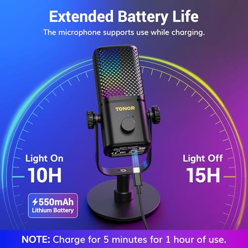 Long Battery Life & Fast Charging: The microphone offers up to 15 hours in no-light mode and 10 hours in RGB mode, while the receiver lasts 10 hours. Both can be used while charging. A quick 5-minute charge gives the microphone an hour of use, keeping your gaming sessions uninterrupted