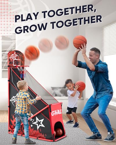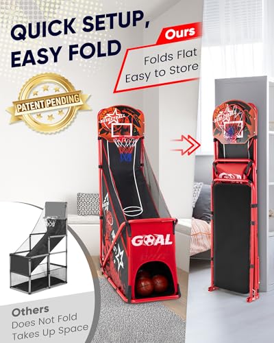 【 Heavy-Duty Iron Frame for Maximum Safety & Stability】Built to last and play safe! We’ve upgraded to a solid iron frame that outperforms flimsy plastic models for this arcade basketball hoop set, resisting bends and tips during energetic games. With its sturdy metal construction, smooth edges, and soft netting, this baskeball hoop is both a secure and durable choice for indoor or outdoor games fun for kids in game rooms, garages, or backyards.