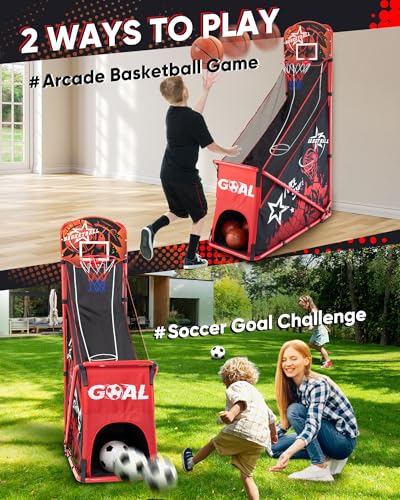 Specification: Basketball Arcade Game for Kids: Foldable Basketball Hoop Set with Soccer Goal- Portable Indoor Outdoor Sports Play Toy- Gift for Ages 3-12 Boys Girls- Air Pump and 3 Balls Included