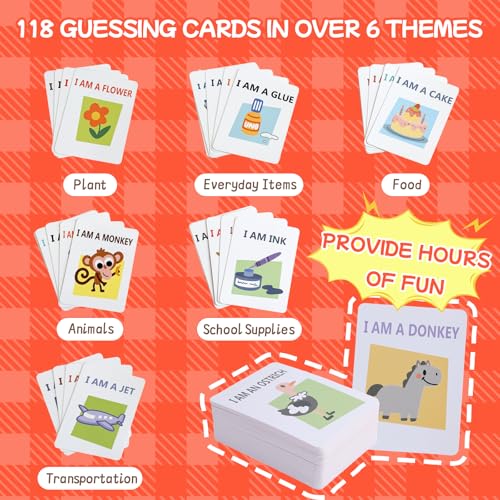 Engaging Guessing Game: This is an interesting quick question game of “what am I?”. This game set includes 118 guessing cards, 4 elastic headbands and 1 sand glass. The cards are printed with plenty of words and the corresponding pictures, including animals, food, daily supplies, etc.