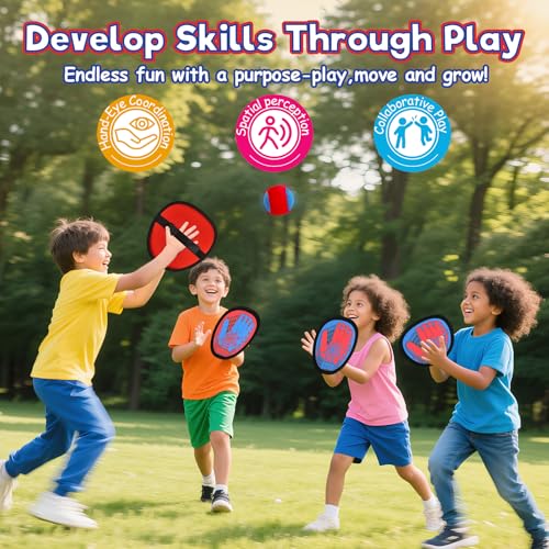 【GREAT KIDS OUTDOOR GAMES】Our toss and catch ball game set is a fun outdoor game and family-friendly activity that brings endless fun to kids. This includes 4 colorful balls, 4 sticky paddles, and a portable storage bag, perfect for travel. It’s an excellent choice for beach, backyard, parties, camping, picnics, lawn, playground or parent-child bonding time.