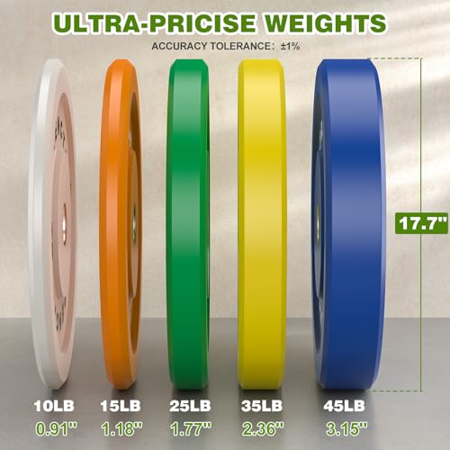 HIGH SHOCK ABSORPTION BUMPER PLATES:Our bumper plates feature a uniform distribution of high-density rubber throughout, effectively cushioning vibrations and impacts during weight training. They absorb shocks, reduce noise during drops, and protect both floors and bars from damage