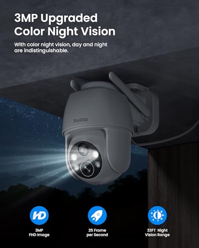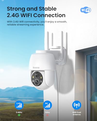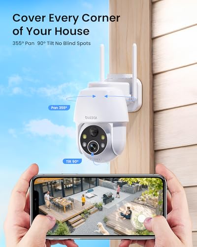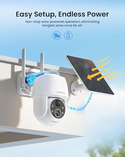 【2K HD & 360°Panoramic Coverage】The solar security camera providing in both 2k(2048*1536) and SD(640*480) resolutions. Buzzai solar ptz security camera rotates up to 355 degrees horizontally and 120 degrees vertically.The solar outdoor camera is equipped with 2 IR lights and 2 white lights to ensure excellent visual effects during the day and night.