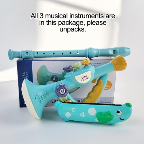 Funny musical toys for toddlers: Multifunction trumpet toy with light and musics; Cute 16 Holes Harmonica; Kid-friendly Recorder Flute. This toy set helps to stimulate children’s interest in music.