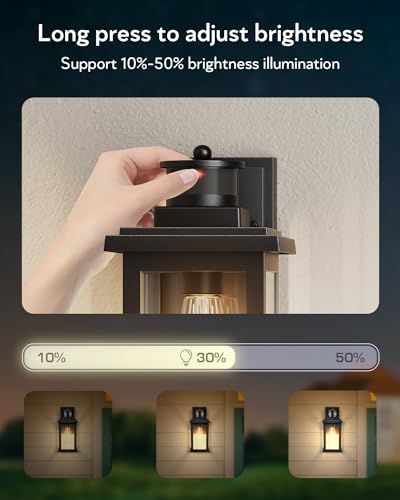 ☀️【Mode one-key switch】Introducing our porch lights outdoor switch modes with just one touch! With a quick press of the sensor button, you can switch between DIM and ECO modes. Red light is DIM mode, green light is ECO mode. No special tools are required – it’s easy! In addition, our porch lights are equipped with a dimmable function, which allows you to adjust the brightness between 10% and 50% during standby. By using this function, you can enjoy significant energy-saving effects.