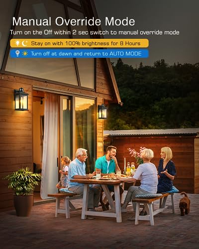 ☀️【 Upgraded Motion Sensor】Experience latest in technology with motion sensor outdoor lights! Featuring 4 modes. ①DIM MODE: 100% brightness when motion is detected at night, 30% brightness the rest of time. ②ECO+ MODE: Keeps the lights off at night, turning on at full 100% brightness when motion is detected. ③D2D Mode: 100% brightness at night, turns off automatically at dawn. ④Override Mode: Maintains 100% brightness for approximately 8 hours, but automatically turns off at dawn and reverts to the previous operating mode.